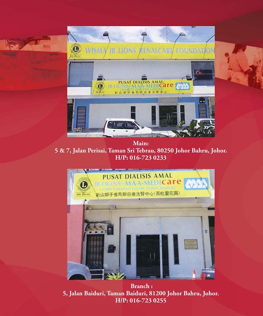 On 26 March 1998, Johor Bahru Lions Clubs and MAA Medicare established the first charity dialysis centre at 49, Jalan Harimao Tarum, Taman Centry, 80250 Johor Bahru to provide cheaper and affordable haemodialysis treatment to the unfortunate patient, irrespective of race and religion.Another dialysis centre was opened on 21 June 2004 at 5, Jalan Baisuri, 81200 Johor Bahru to cater for the ever increasing number of kidney patients.